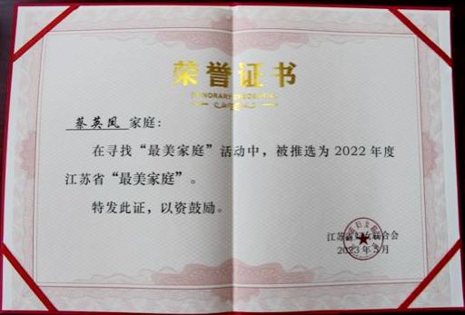 近日,江蘇省婦聯表彰了2022年度江蘇省“最美家庭”,我校蔡英鳳家庭光榮上榜。