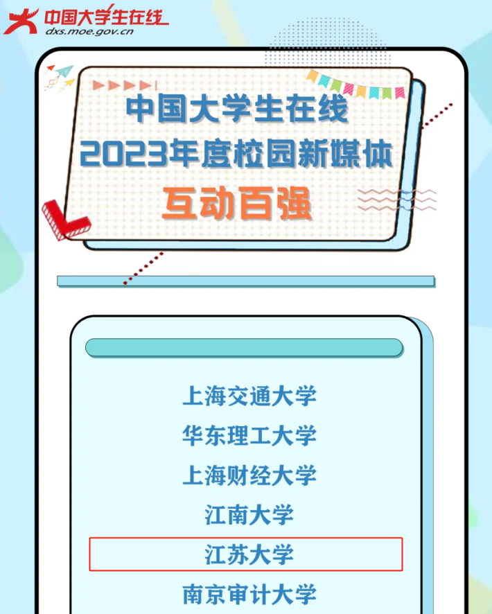 近日,教育部“中國大學生在線”公布2023年度校園新媒體表彰名單,我校入選“校園新媒體互動百強”。