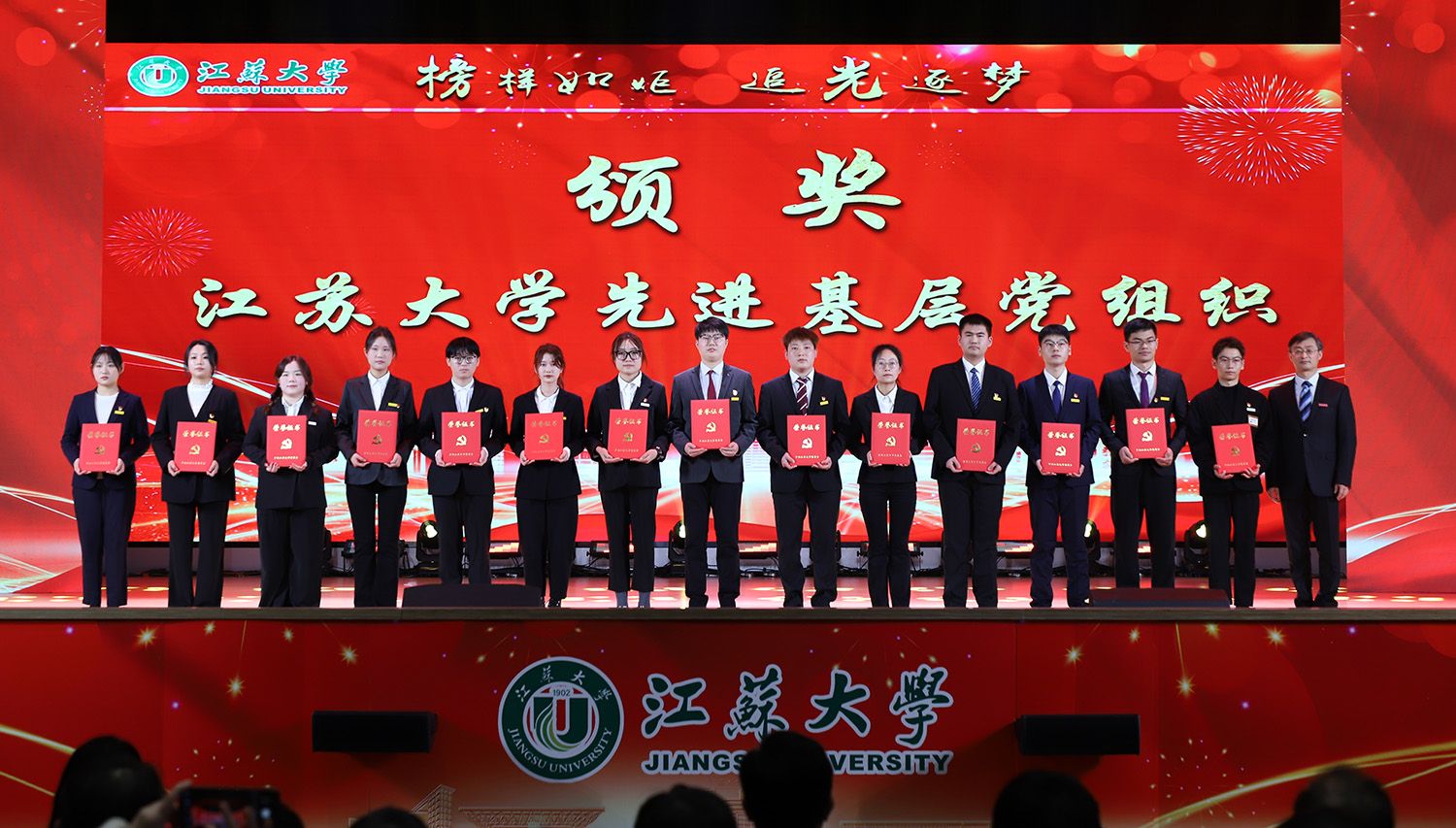校關(guān)工委常務(wù)副主任柴順根、黨委辦公室主任施進(jìn)華為2023年度校先進(jìn)基層黨組織代表頒獎(jiǎng)。