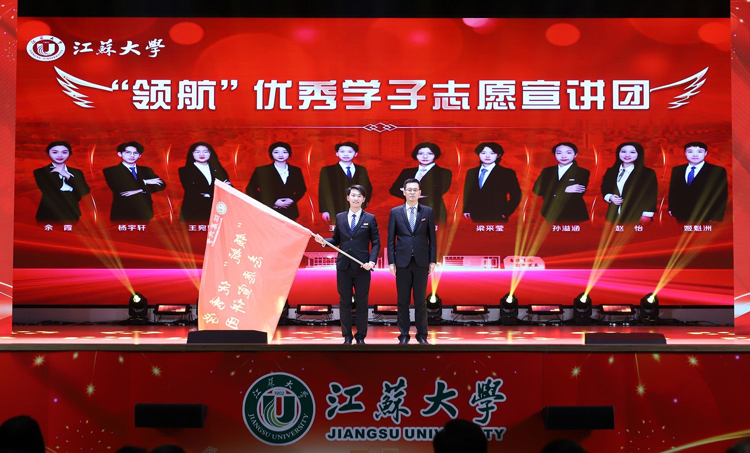 校團(tuán)委書記張永強(qiáng)為“領(lǐng)航”優(yōu)秀學(xué)子宣講團(tuán)授旗,團(tuán)隊(duì)成員代表王龍海接旗。