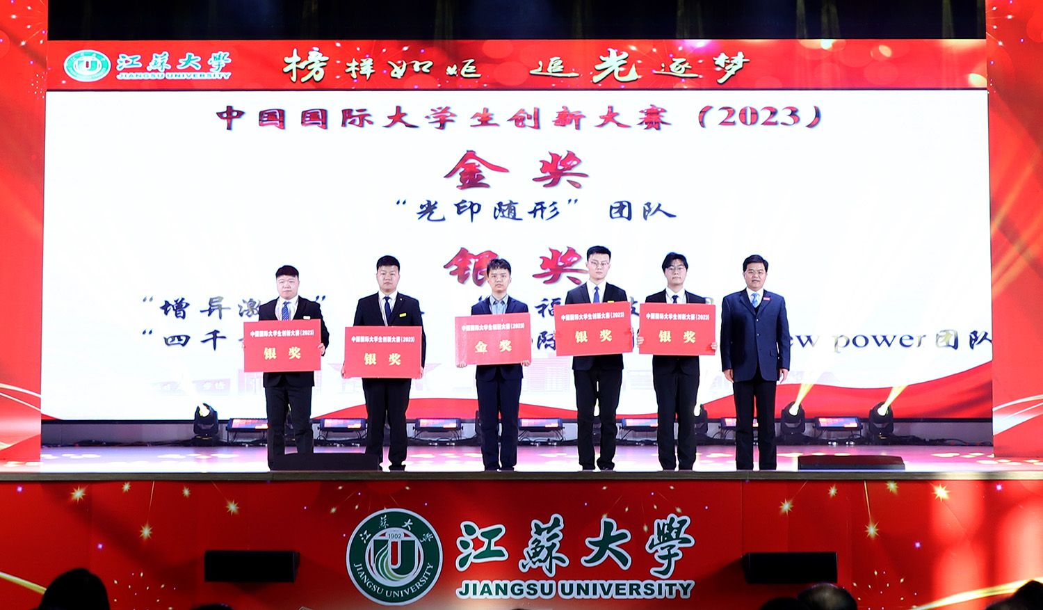 李洪波為獲得2023年中國國際大學(xué)生創(chuàng)新大賽國賽金獎(jiǎng)、銀獎(jiǎng)的團(tuán)隊(duì)代表頒獎(jiǎng)。
