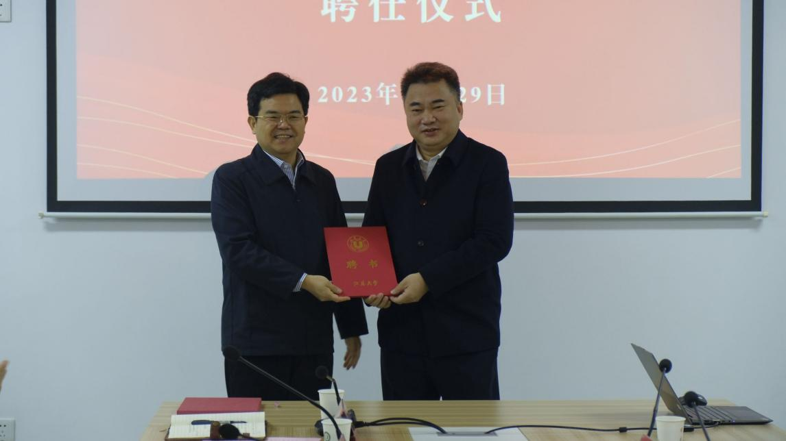 王文生客座教授聘任儀式在一站式服務中心會議室舉行。李洪波為王文生頒授了江蘇大學客座教授聘書并佩戴江蘇大學校徽。他向鎮江市公安局一直以來對我校安全穩定工作的支持與關心表示感謝,希望進一步加強警校合作,助力我校法治人才培養質量提升。