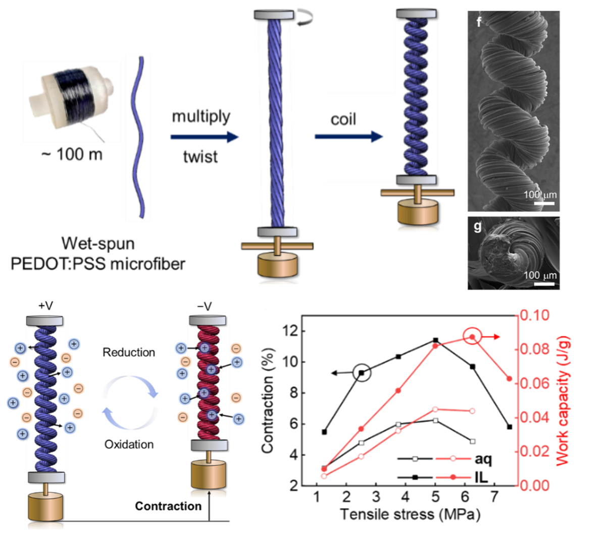 輕量型人工肌肉因其出色的柔韌、高效和快速響應性,在軟體機器人、假肢及生物醫學設備等領域展現廣泛前景。然而,當前人工肌肉仍面臨低應變、低功率密度及高成本等挑戰。本工作創新性地研發出了基于純導電聚合物卷曲紗線的人工肌肉,揭示了高強度導電聚合物微纖維的驅動機制,具有卷曲紗線結構的人工肌肉在5MPa高應力下收縮應變超過11%,且僅需1V電壓即可承載超過自身質量4000倍的載荷。此外,這種人工肌肉還具有水合誘導收縮特性和快速恢復能力,成為具有成本效益的碳納米管替代品,為人工肌肉的大規模、低成本制備提供了新路徑。