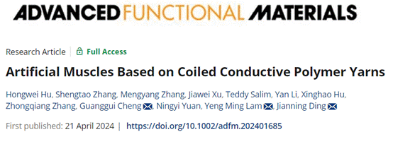 近日,機械工程學院科研團隊在功能材料領域頂級期刊《先進功能材料》(Advanced Functional Materials)上發表了題為“Artificial Muscles Based on Coiled Conductive Polymer Yarns”的研究論文。胡宏偉副研究員為論文第一作者,程廣貴教授、丁建寧教授和新加坡南洋理工大學Lam Yeng Ming教授為共同通訊作者。