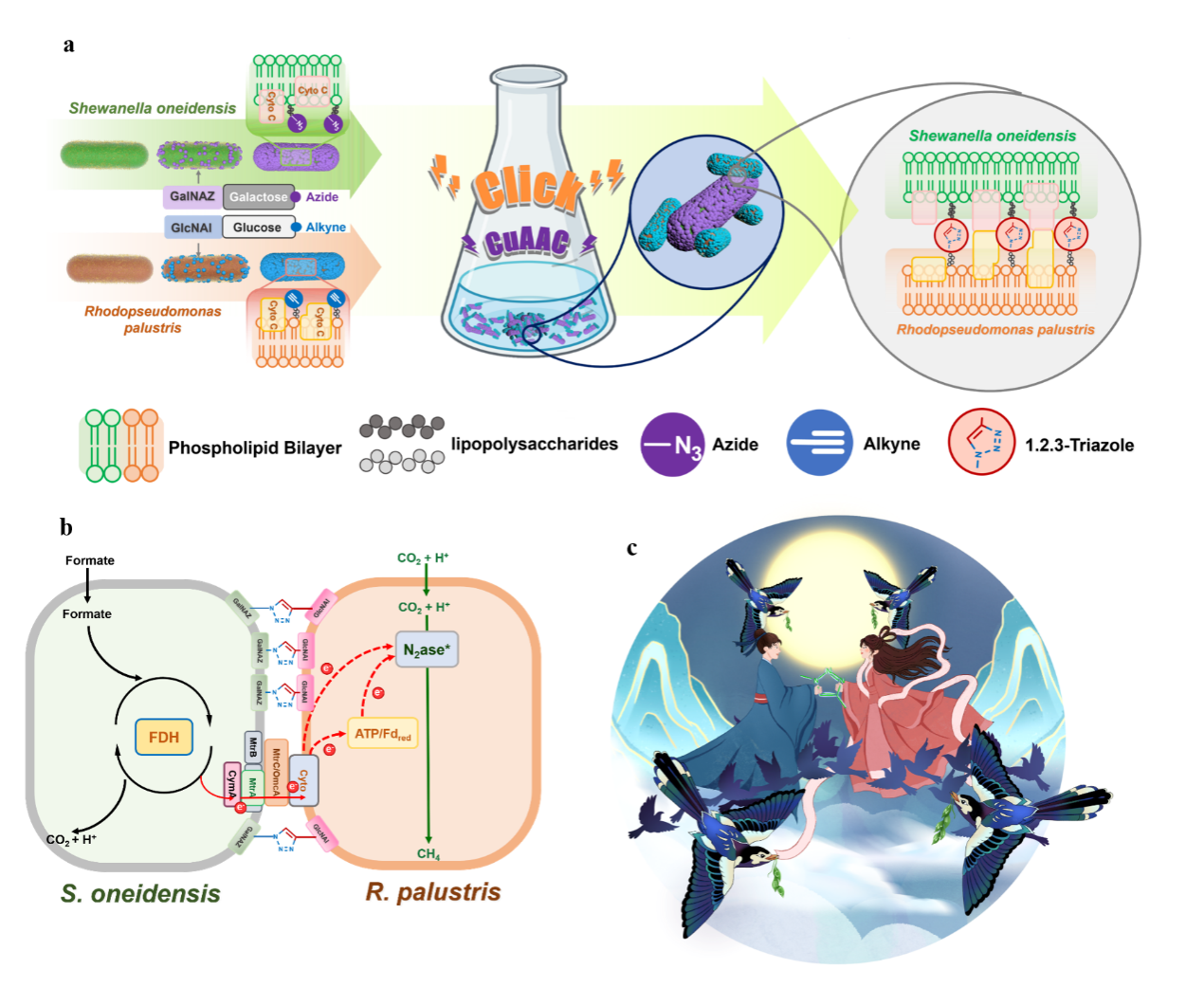 針對以上關鍵難題,該研究提出了“細胞間距”是決定DIET的關鍵因素的科學假設和“細胞鵲橋工程”的DIET調控新思想(圖1)。據此,課題組以希瓦氏菌(S. oneidensis,SO)和沼澤紅單胞菌(R. palustris, RP)為典型模型,設計了活細胞點擊化學(Living Cell-Cell Click Chemistry)新策略。該策略為SO菌和RP菌搭建“鵲橋”,使“牛郎”菌(SO)終與“織女”菌(RP)相會,實現了不同種屬細胞之間分子尺度的特異性直接鏈接。