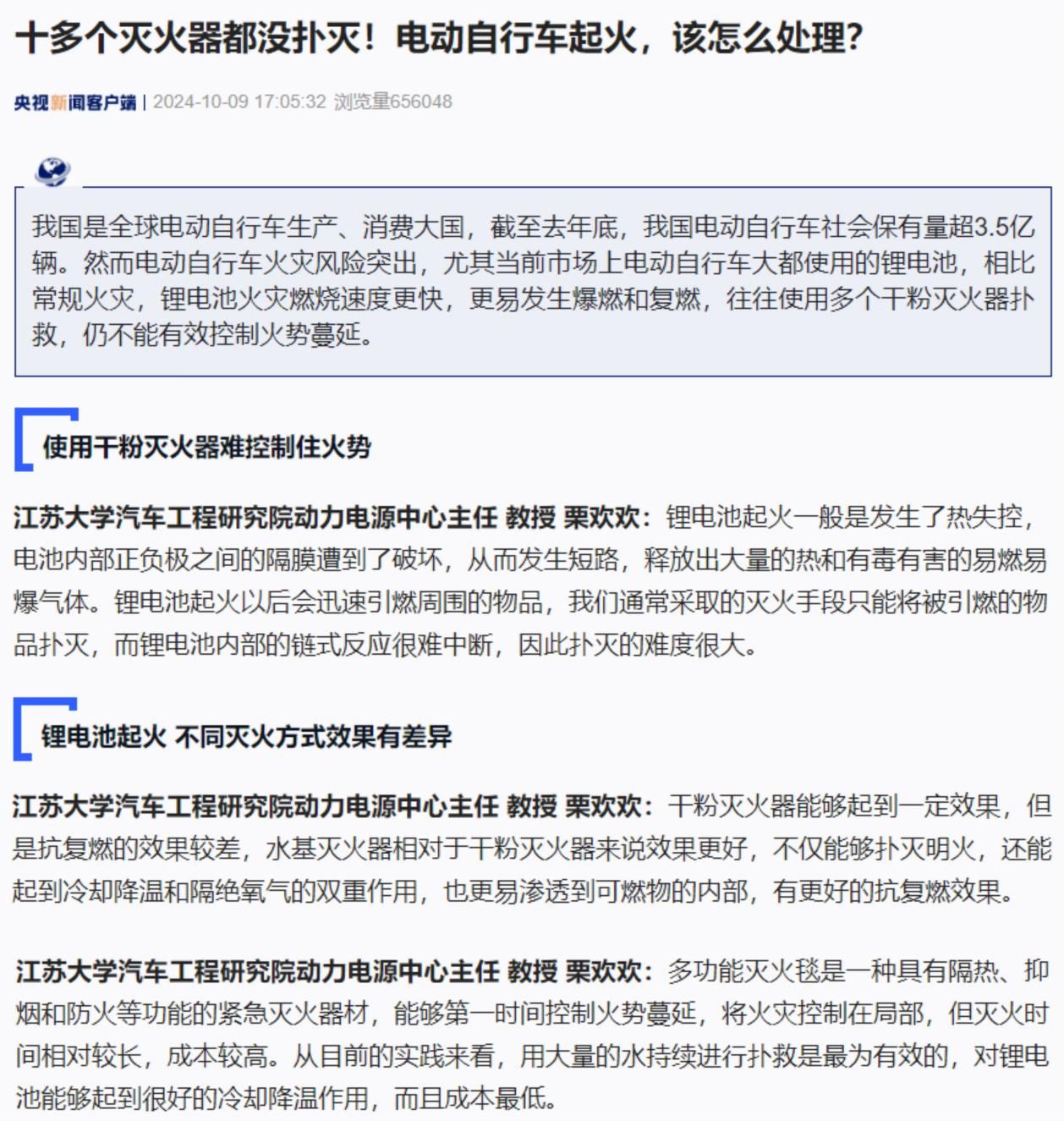 10月9日,《央視新聞》及其客戶(hù)端刊發(fā)《十多個(gè)滅火器都沒(méi)撲滅!電動(dòng)自行車(chē)起火,該怎么處理?》,深度報(bào)道我校汽車(chē)工程研究院栗歡歡教授從事的鋰電池安全研究成果服務(wù)社會(huì)消防安全建設(shè)的情況。