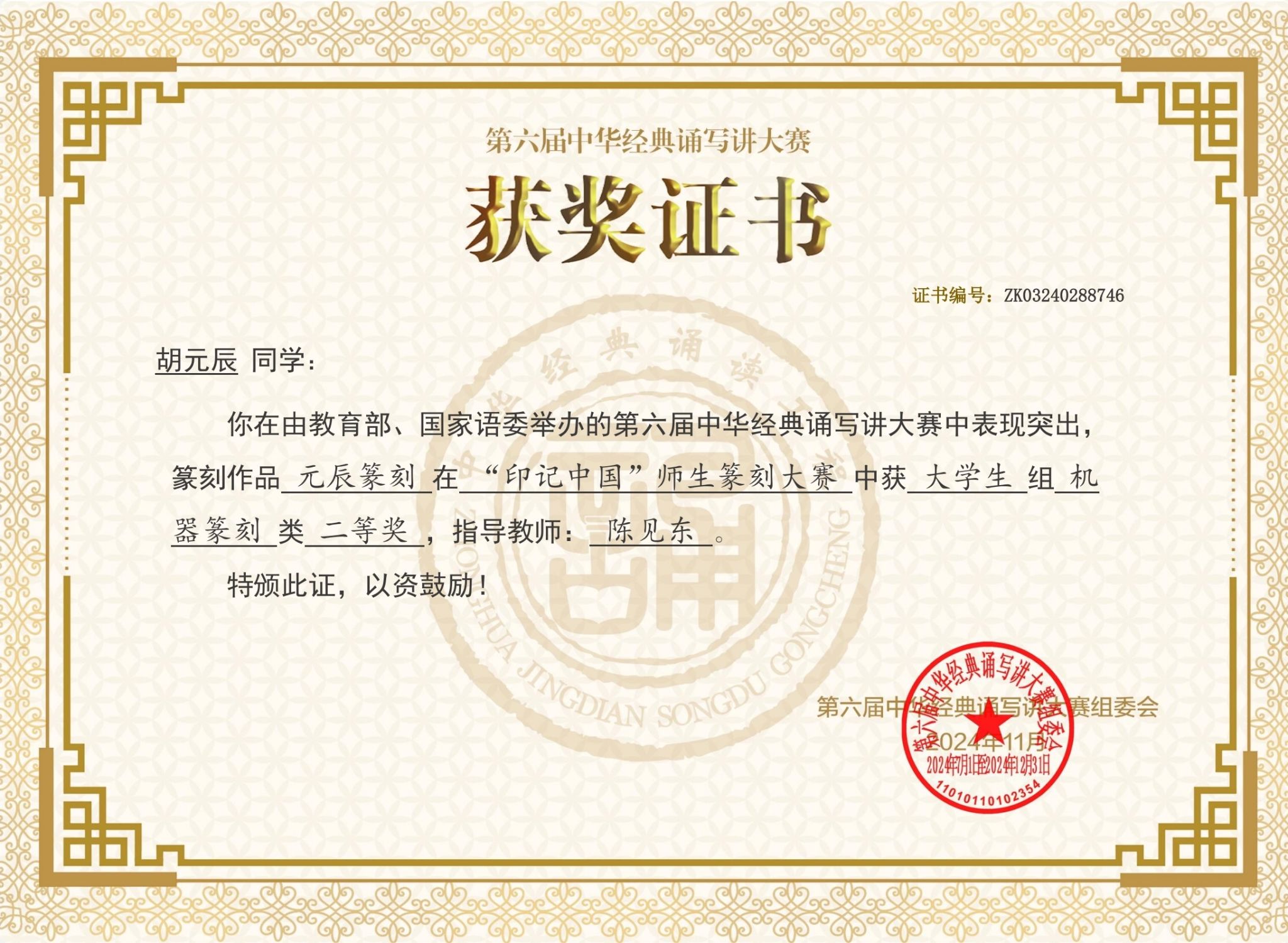 近日,第六屆中華經(jīng)典誦寫講大賽之“印記中國”師生篆刻大賽獲獎名單正式公布。我校藝術(shù)學(xué)院胡元辰同學(xué)的篆刻作品《元辰篆刻》(指導(dǎo)教師:陳見東),經(jīng)過逐級選拔和專家評審,榮獲大學(xué)生組機(jī)器篆刻類二等獎。