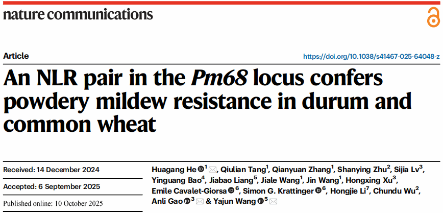 近日,生命科學學院何華綱團隊聯(lián)合多家單位在Nature Communications上發(fā)表題為An NLR pair in the Pm68 locus confers powdery mildew resistance in durum and common wheat的研究性論文,報道了小麥抗白粉病新基因Pm68的圖位克隆,并揭示了該基因的起源和抗病分子機理。江蘇大學生命科學學院為第一完成單位,何華綱為第一作者兼通訊作者,合作單位河南大學高安禮副教授和中國科學院分子植物科學卓越創(chuàng)新中心王亞軍研究員為共同通訊作者,生命科學學院碩士研究生唐秋蓮、張倩淵分別為第二、第三作者。