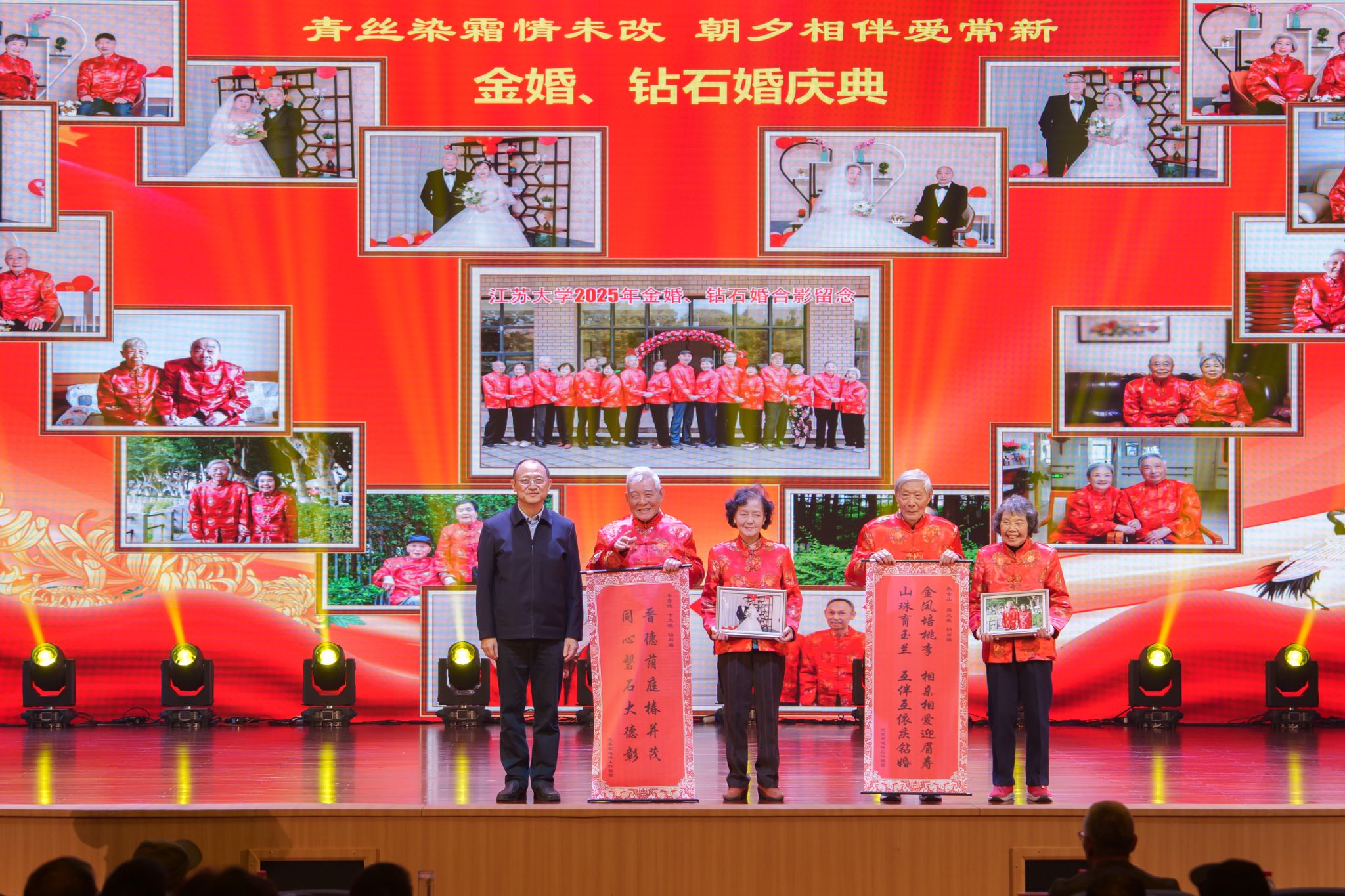 金婚、鉆石婚慶典環(huán)節(jié),陸洪標(biāo)、張濟(jì)建分別為金婚、鉆石婚代表頒發(fā)禮品。現(xiàn)場掌聲陣陣,溫馨氛圍感染全場。今年,學(xué)校共有金婚夫婦11對、鉆石婚夫婦8對。離退休工作部提前為他們拍攝紀(jì)念照,綠野詩社為每對夫婦撰寫了祝福楹聯(lián)。