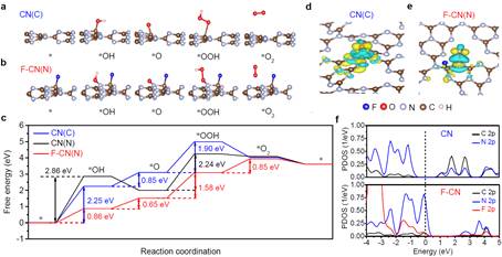 依此,閆研教授課題組通過精細地原位界面表征技術,首次確認了氮化碳光反應過程中碳位點氧化形成的惰性中間體C=O的累積是阻礙水分解反應的瓶頸所在。此外,進一步提出了表面氟化占據碳位點的策略,成功阻止了C=O惰性中間體的形成,使單相氮化碳材料在不借助產氧助催化劑的條件下將純水分解為氫和氧,解決了困擾科學界已久的氮化碳材料表面分解水反應瓶頸的本質問題。該研究厘清了氮化碳材料界面反應中間體與催化性能間的密切關系,對催化劑的表面狀態、水分子構型、和催化反應可行性之間關系的認識得到進一步深入。