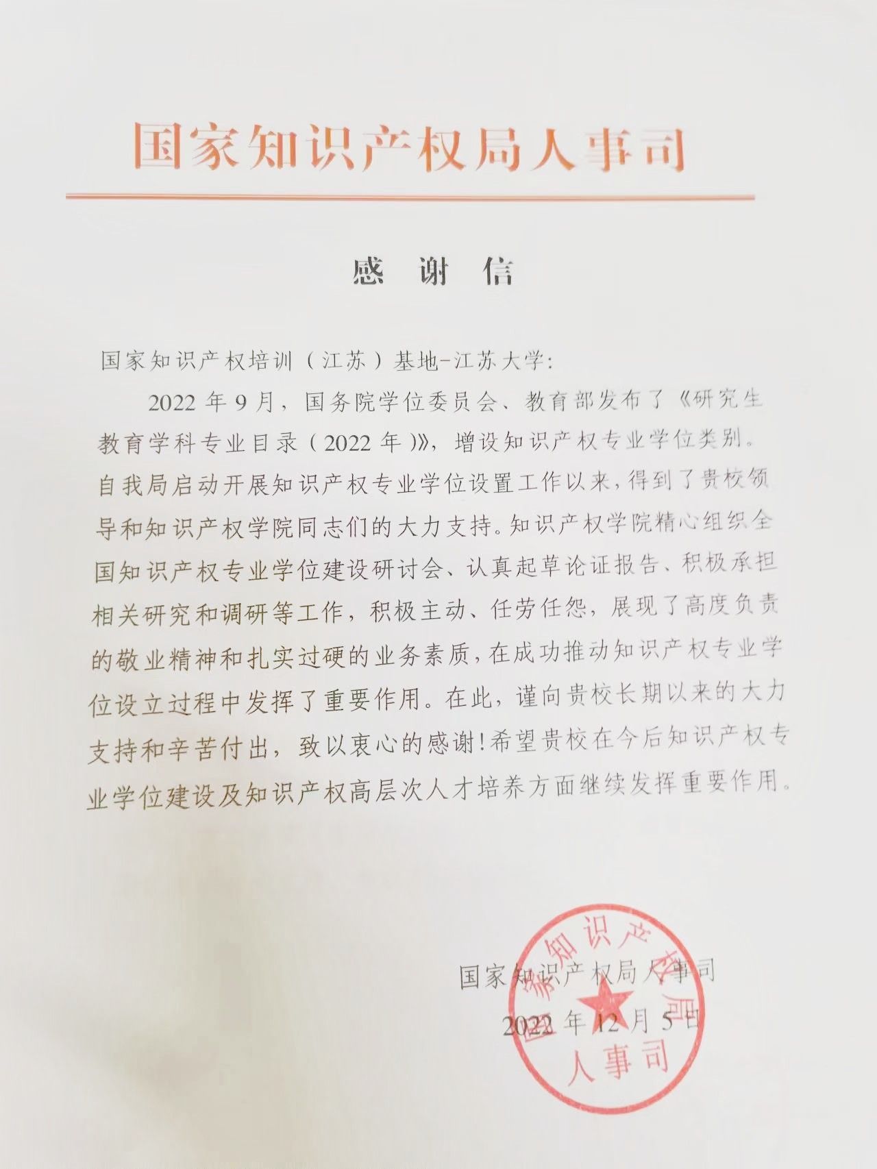 日前,國家知識產權局人事司向學校發來感謝信,感謝江蘇大學在知識產權專業學位申請設立工作中的辛勤付出和工作成效,并希望學校在知識產權專業學位建設及知識產權高層次人才培養方面繼續發揮重要作用。