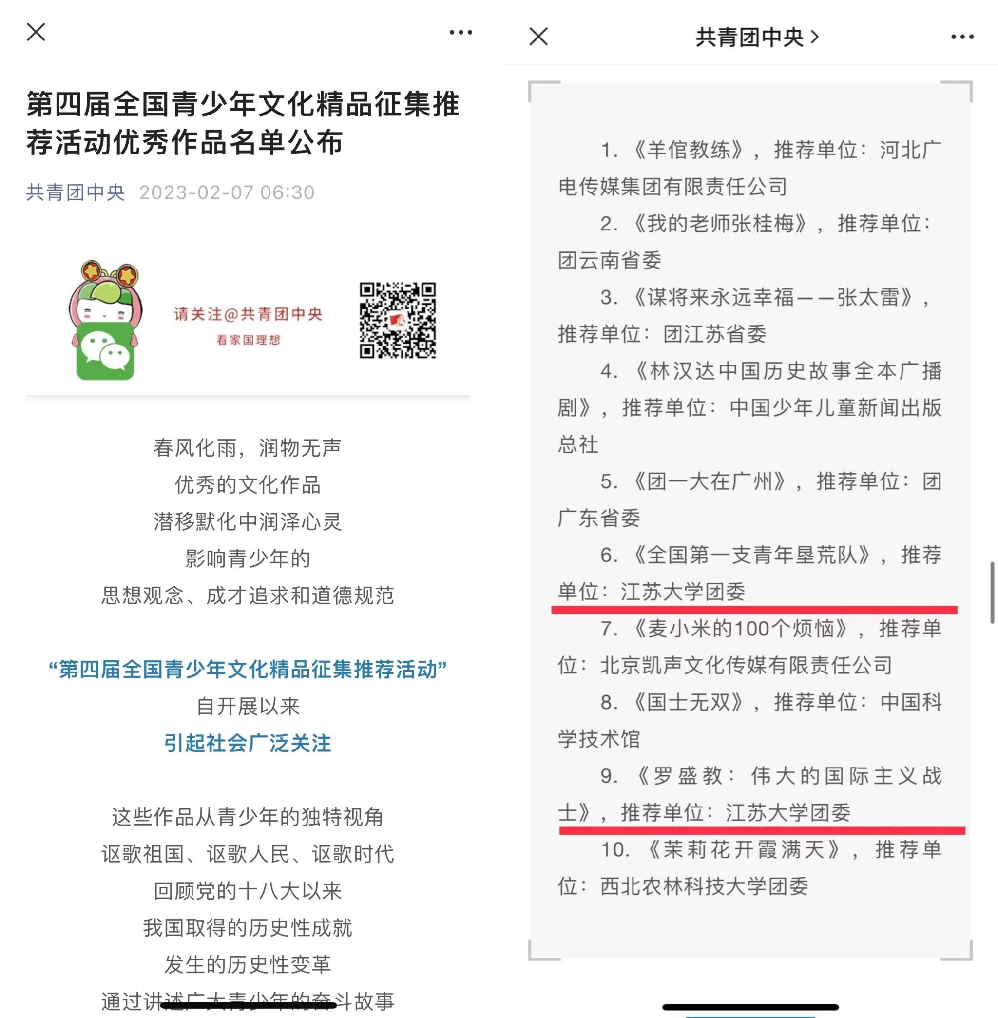 第四屆全國青少年文化精品征集推薦活動由團中央宣傳部組織開展,自啟動以來,引起廣泛關注,共評選出優秀作品70項。我校創作的廣播劇《全國第一支青年墾荒隊》和《羅盛教:偉大的國際主義戰士》,結合迎接學習宣傳貫徹黨的二十大、慶祝建團100周年主題,再現了羅盛教光輝的一生和第一支青年墾荒隊的青春故事,被“共青團中央”“學校共青團”官微專門發布(單條閱讀量10W+),并獲第二屆江蘇省大學生網絡文化節優秀作品(音頻類)一等獎,社會反響良好,有效提升了學校“網上共青團”育人實效。