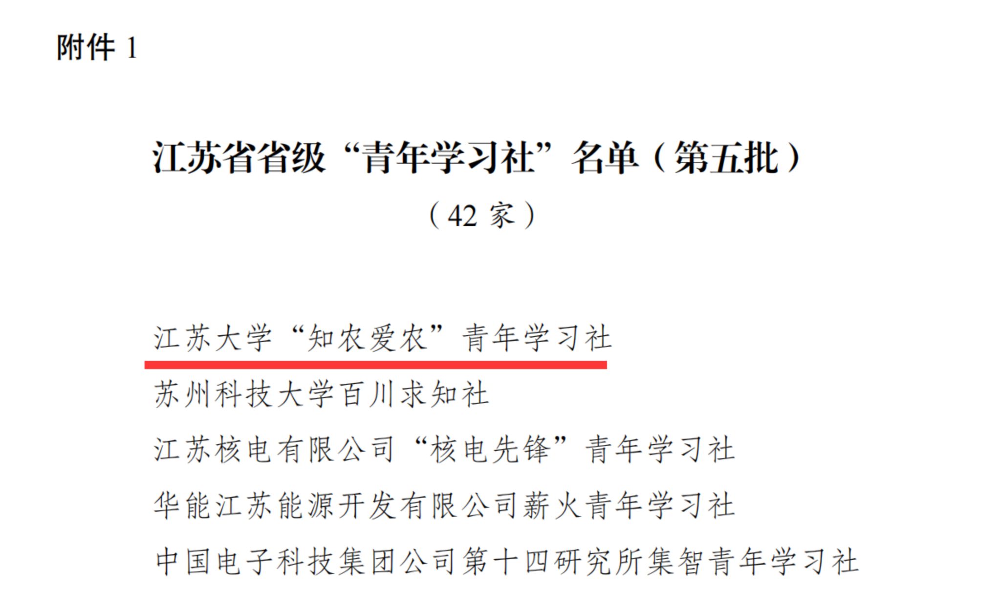 近日,共青團(tuán)江蘇省委發(fā)布《關(guān)于命名江蘇省省級(jí)“青年學(xué)習(xí)社”及線路的決定》,全省共42家“青年學(xué)習(xí)社”被命名為第五批省級(jí)“青年學(xué)習(xí)社”,我校“知農(nóng)愛(ài)農(nóng)”青年學(xué)習(xí)社入選。