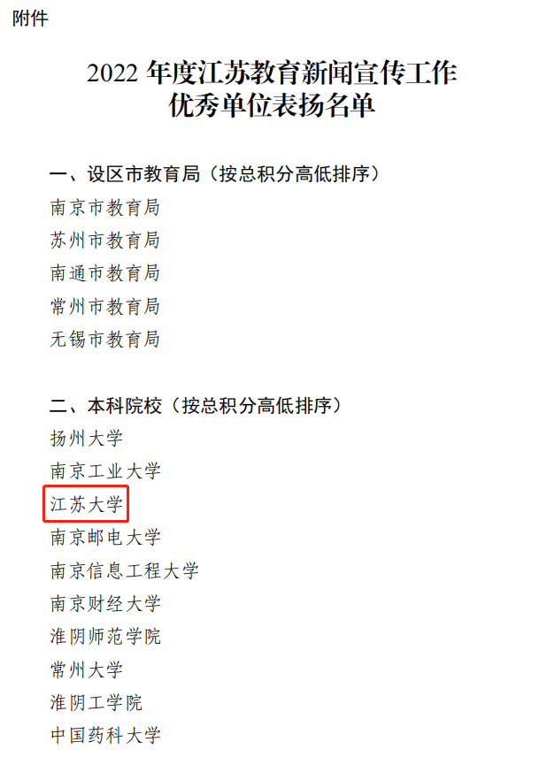 江蘇教育新聞宣傳工作優秀單位評選是根據《全省教育系統新聞宣傳工作積分統計細則》相關精神,由省教育廳辦公室(新聞辦)結合各單位年度廳屬媒體內容保障得分和綜合評價情況,對5個設區市教育局、20所本科院校、20所高職(專科)院校予以表揚。