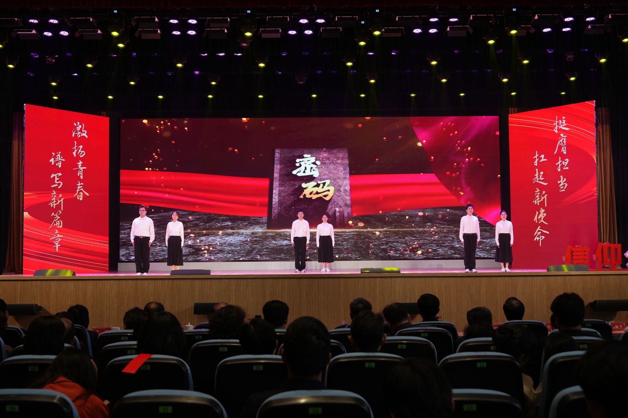 管理學(xué)院物流管理2202 團支部帶來《青春底色》主題風(fēng)采展示。校十佳青年教職工獲獎代表帶來《以青春之我,赴青春之約》朗誦。大學(xué)生藝術(shù)團帶來開場舞《盛開》和朗誦《密碼》。