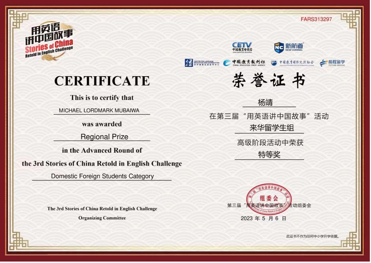 近日,我校津巴布韋籍留學生楊靖在第三屆“用英語講中國故事”活動中獲全國總決賽特等獎。