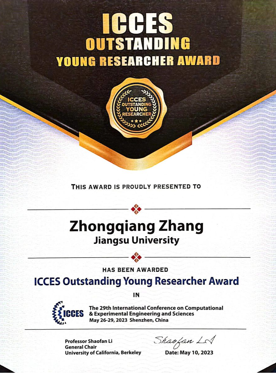 本次會議經計算與實驗科學工程國際會議委員會推舉、評選,江蘇大學張忠強教授、上海交通大學張律文教授、南京航空航天大學殷俊教授、華中科技大學肖蜜教授、河海大學傅卓佳教授等5位青年學者榮獲ICCES杰出青年學者獎,哈爾濱工程大學張阿漫教授為五位獲獎者頒獎。