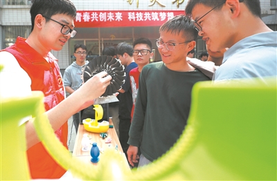 ④在江蘇大學(xué)鐘靈書院門前,學(xué)生在進(jìn)行機(jī)創(chuàng)賽成果展示。