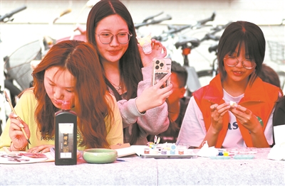 ⑤在“求真尚美,‘藝’路生花”——“一站式”學(xué)生社區(qū)美育浸潤行動(dòng)中,一名江蘇大學(xué)學(xué)生(中)與自己的作品合影。