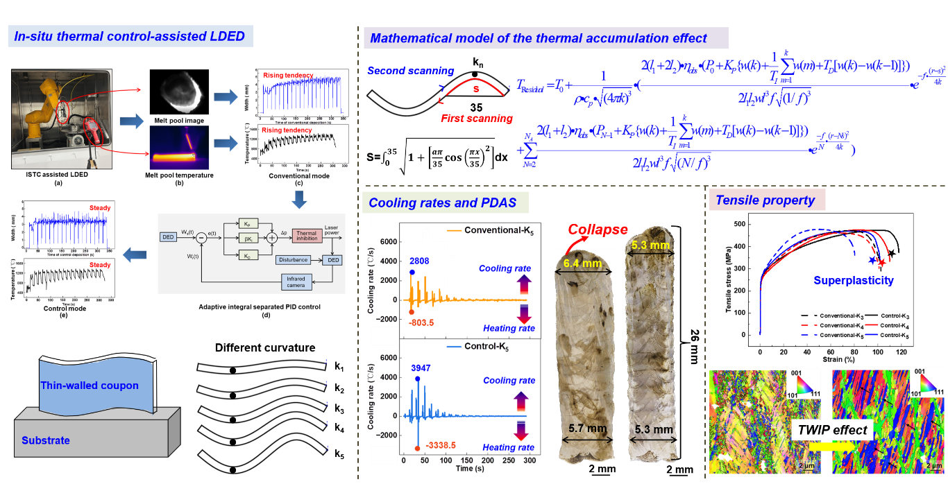 該研究成果提出了一種熔池原位控制輔助激光定向能量沉積工藝(ISTC-LDED),推導了以經典熱傳導理論為基礎的平面和曲面薄壁件熱效應模型,該技術闡明了層間柱狀晶和等軸晶的連續演化機制并實現了構件厚度一致性。同時,ISTC-LDED技術誘導的316L不銹鋼孿晶塑性變形效應可以顯著提升強韌性。博士生蘇尤宇為第一作者,羅開玉教授、魯金忠教授為通訊作者。