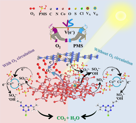 該工作構建了具有合適缺陷濃度的雙空位S型異質結VO-M-Co3O4@CNx,表現(xiàn)出優(yōu)異的PMS活化能力和光激發(fā)協(xié)同作用,實現(xiàn)了無曝氣高效降解有機污染物。VO-M-Co3O4@CNx 在厭氧條件下的降解速率(4.58 min-1 g-2)高于有氧條件下的降解速率(1.67 min-1 g-2),優(yōu)于典型的異質結催化劑降解體系。原位實驗和DFT 研究揭示缺陷誘導的光生電子介導的PMS活化,闡明O?和PMS在 VO-M-Co3O4@CNx上的競爭相互作用。該研究首次強調了催化劑中O?和PMS之間的競爭作用是調控PMS活化協(xié)同光激發(fā)的關鍵,對開發(fā)無需曝氣的高級氧化工藝協(xié)同光催化在水處理領域產生重要意義。